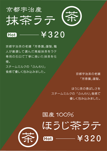 左が「抹茶ラテ」、右が「ほうじ茶ラテ」です。いわゆるラテアートは、まだまだできませんが味は保証します。抹茶は、京都宇治茶の老舗「芳香園」謹製。職人が厳選して選んだ高級抹茶を、ラテ専用の石臼で丁寧に挽いたものを仕様しています。低速で石臼を廻すため摩擦熱によるお茶の変質が防げます。手のかかる昔ながらの製法により、風味を引き出しています。ほうじ茶も「芳香園」謹製、国産100%です。香ばしい香りがスチームしたふんわりミルクと相性抜群です^^