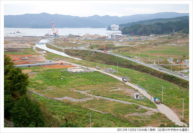 1年前と比べると家々があった土地の土台が掘り起こされ、土の山が所々に出現しているのが分かります。海の向こうに見える巨大な赤と白の重機も、数週間前に気がつきました。