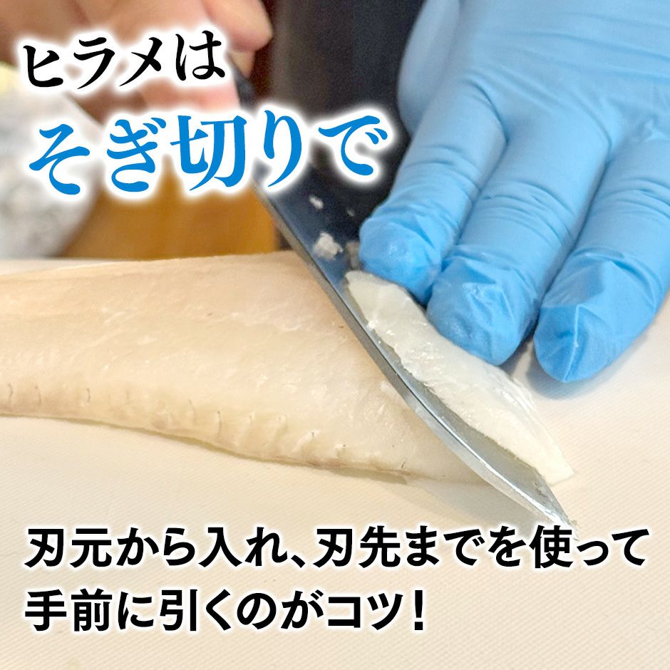 ヒラメは左側から斜めに削いで切る「そぎ切り」がオススメです。 刃元から入れ、刃先までを使って手前に引くのがコツ!