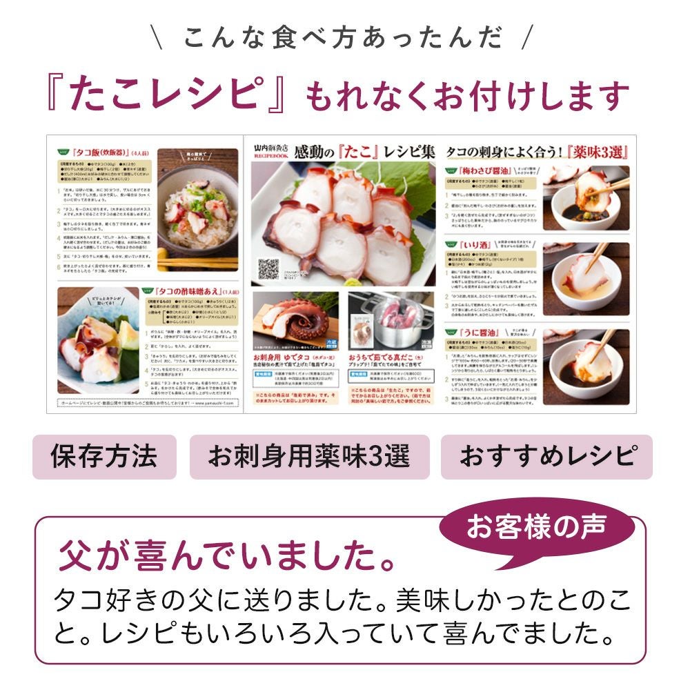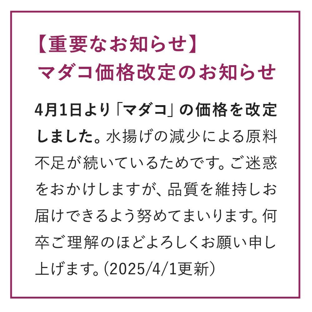 他の画像を見る 生鮮品 包装・のし 600g〜1.2kg クール便でお届け 4.83 29件 南三陸志津川真だこ(頭付き)《クール冷蔵発送》※生鮮品 販売価格 ¥ 5,180 税込 ご注文はこちら お気に入り登録