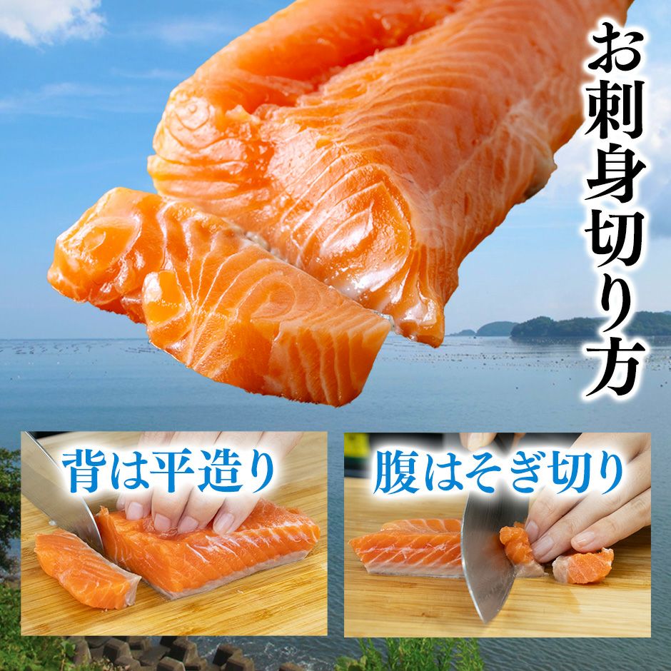 活け締め、高品質な魚粉や大豆、ミネラル類を含む人工配合飼料により、高品質で鮮度の高いサーモンが育ちます。