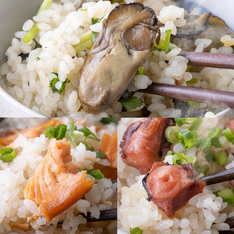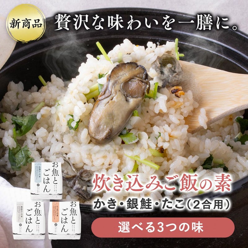 牡蠣・銀鮭・たこ、それぞれの旨みを活かして、素材ひとつで炊き上げるちょっと贅沢な炊き込みごはんです。 専用の調味だれ付きで、ごはんと一緒に炊くだけ。