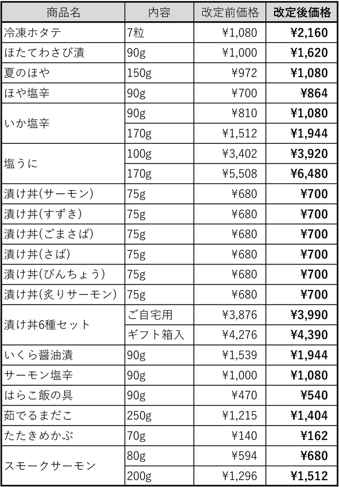 ここ数年、さまざまな海産物が水揚げ不足により市場価格が高騰しております。特にホタテにつきましては、原料の水揚げが著しく減少し、市場価格も大幅に上昇しております。