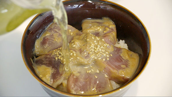 最後に熱いお茶をかけて完成です。お好みでわさびやネギを加えてもいいですね。暑い夏にもぴったりの『カツオのごま茶漬け』ぜひお試し下さい。