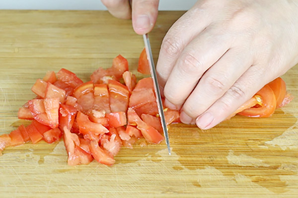 「トマト」は種を取り、1.5cm角に切ります。(全体的に水っぽくならないように、種をしっかり取り除きましょう。)