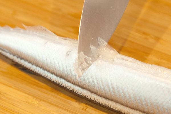 さんまにもウロコがあるのをご存知ですか?さんまのお腹の白い部分をこうして包丁でこすりウロコを取っていきます。少ししかありませんが、ウロコがあると食感がザラザラしますのでぜひウロコ取りましょう。日本料理の料亭や割烹店などでの焼き方は鱗をきちんと取り除いています。